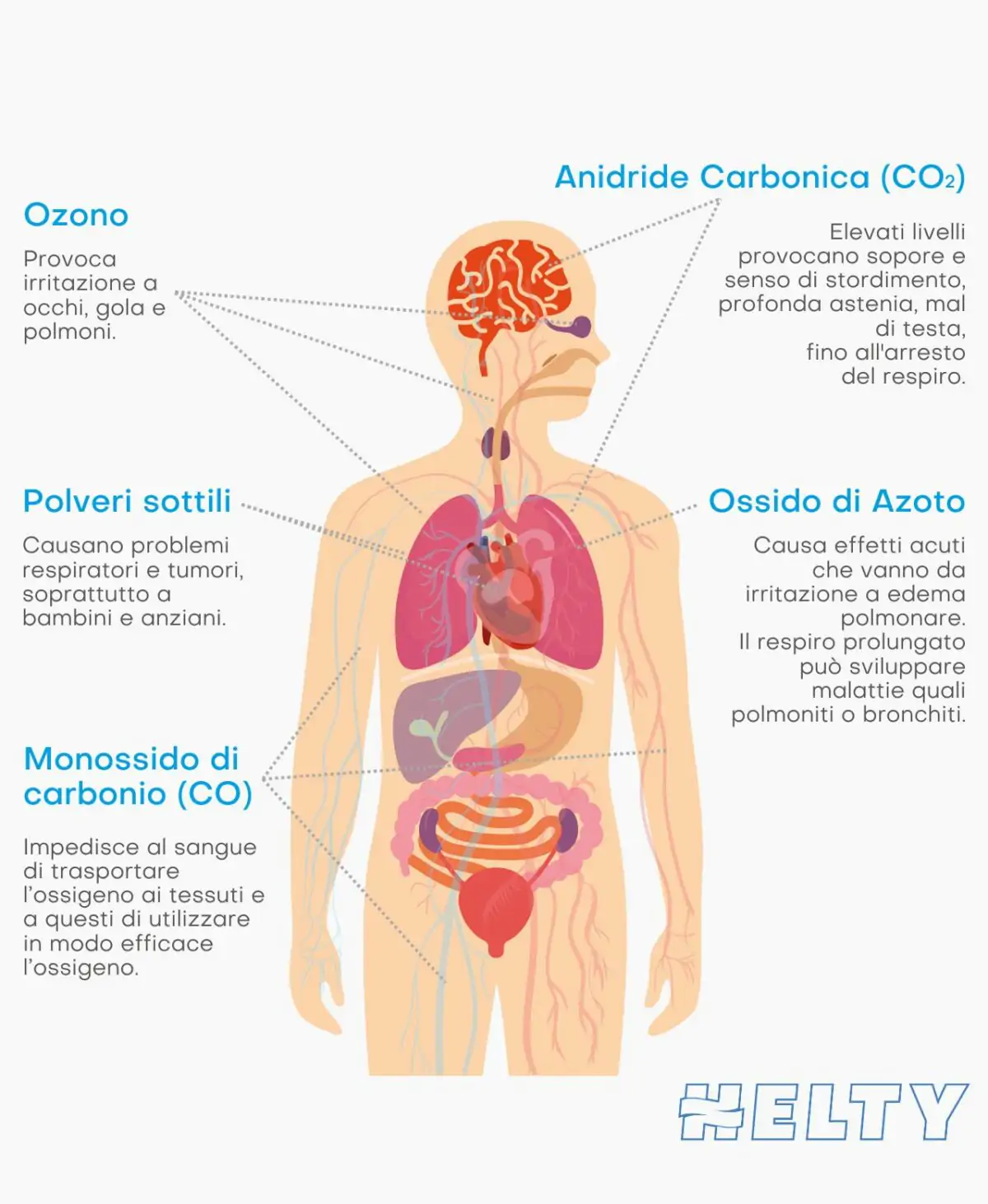 Ozono: si forma quando gli inquinanti prodotti dai motori dei veicoli e dalle industrie incontrano i raggi solari ultravioletti. Più presente in estate, rende le ondate di calore ancora più aggressive.