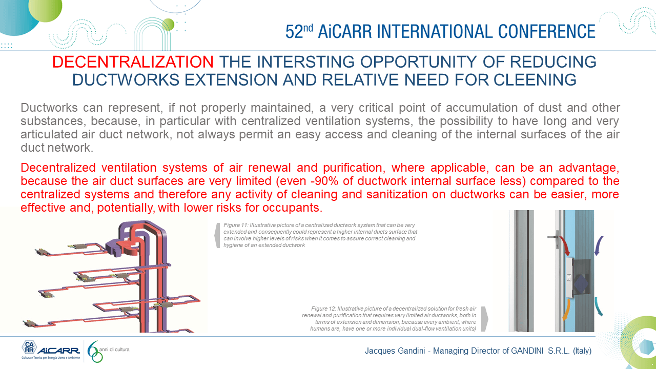 Configurazioni impiantistiche basate su sistemi di VMC decentralizzata “stanza su stanza”, che richiedono canalizzazioni d’aria molto limitate sia in termini di estensione che di superfici interne a contatto con l’aria (inferiori anche al 90% rispetto ai canalizzati), semplificano e rendono più facilmente eseguibile le operazioni di sanificazione dei canali.