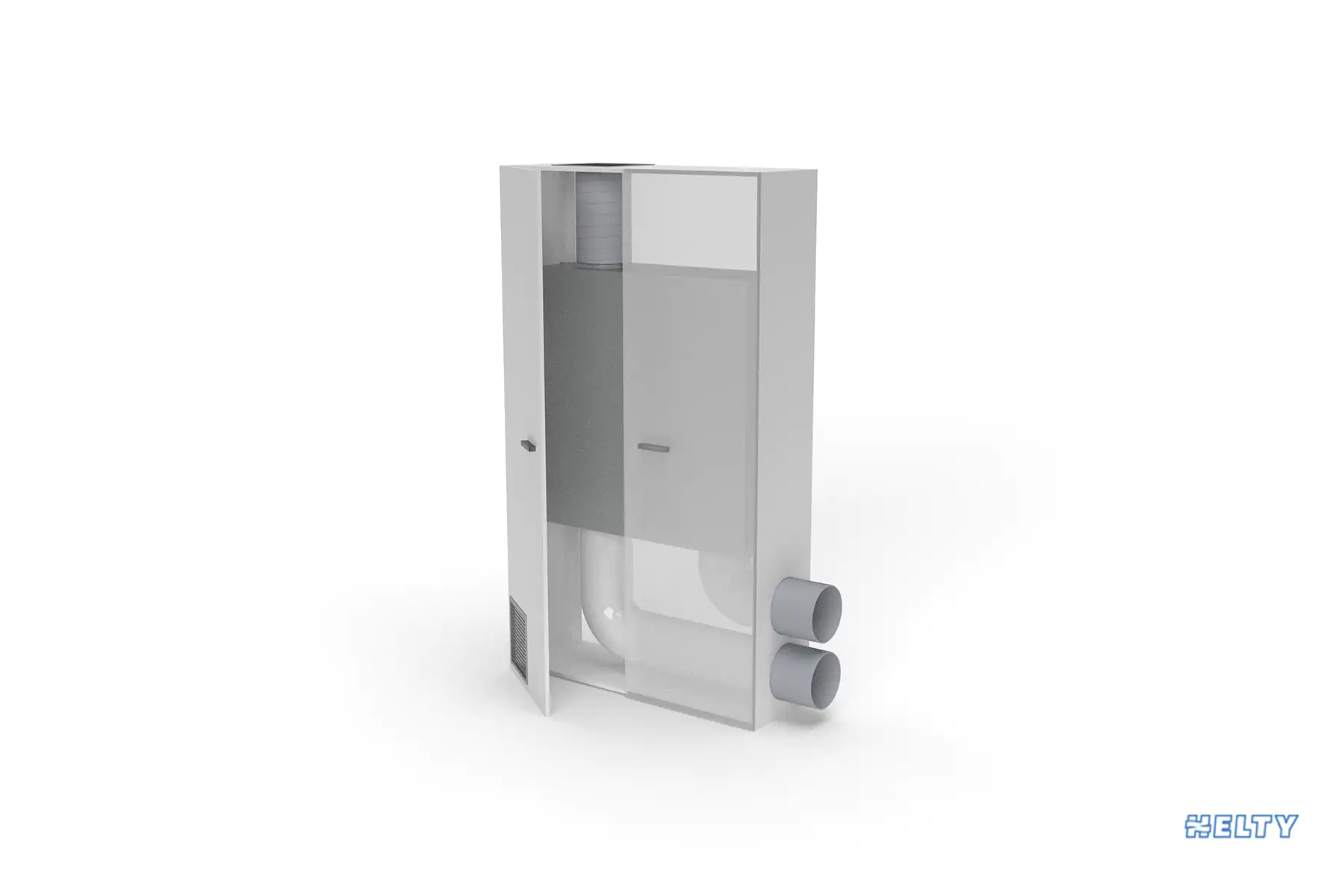Evoluzione del modello a soffitto, Helty Flow M800 rappresenta una valida alternativa impiantistica per la ventilazione nelle aule scolastiche. Posizionata all’interno di un mobile bianco verticale, questa tecnologia si integra nella stanza come un normale armadio, contestualizzandosi perfettamente a livello estetico. Il contenitore ad ante battenti permette una migliore facilità di accesso per la manutenzione e il cambio dei filtri, reso agevole dalla presenza di un apposito sportello di ispezione sul lato del mobile.