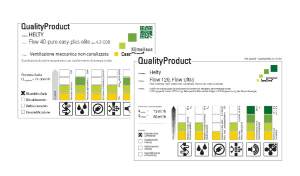 Die Performance in puncto Wärmerückgewinnung in Höhe von 91% wurde vom TÜV bescheinigt. Die Effizienz in Bezug auf die Abscheidung von Feinstaub und VOC (flüchtige organische Verbindungen) wird von Tests bestätigt, die im Fachbereich Chemie an der Universität Mailand durchgeführt wurden. FlowEASY, FlowPLUS und FlowELITE haben das KWL-Qualitätssiegel Casa Clima erhalten und wurden im Rahmen der Zertifizierung des Gesundheitsschutzes in Räumen nach Biosafe validiert