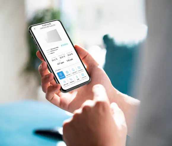 The Helty FlowELITE dual-flow mechanical ventilation system is designed to respond smartly to the need to protect your home from the excessive concentration of harmful substances. Special IAQ sensors allow you to monitor not only the humidity but also the CO2 and VOC levels and therefore the overall air quality inside the room at all times. This lets the ventilation unit automatically increase the air flow rate when necessary, returning to normal operation the moment healthy indoor conditions are restored.
