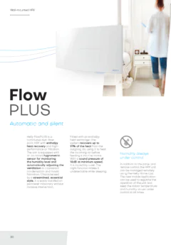 With FlowPLUS the air in the house is always fresh, pleasant and purified. Equipped with a hygrometric sensor as standard, this HRV measures the level of humidity in the air and automatically adjusts operation as appropriate.Ideal climatic conditions are maintained within the environments, avoiding the formation of condensation and mould. In addition, the integrated enthalpy heat exchanger, tested at TÜV SÜD pursuant to the EN 13141-8 standard, means the system can recover up to 91% of the heat from extracted air and transfer that heat to the incoming air before delivery indoors.