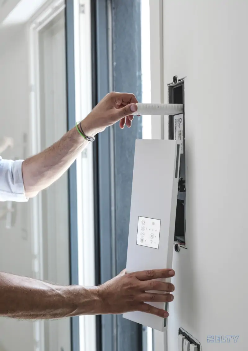 Los sistemas VMI ocultable Helty son adecuados para proyectos de renovación energética y edificios nuevos de alta eficiencia que requieren soluciones avanzadas de ventilación mecánica controlada sin comprometer la estética y las dimensiones. Los VMI empotrados en la pared simplifican la fase de diseño y ofrece la oportunidad de integrar un sistema de ventilación con recuperación de calor en cada habitación sin quitar espacio habitable.