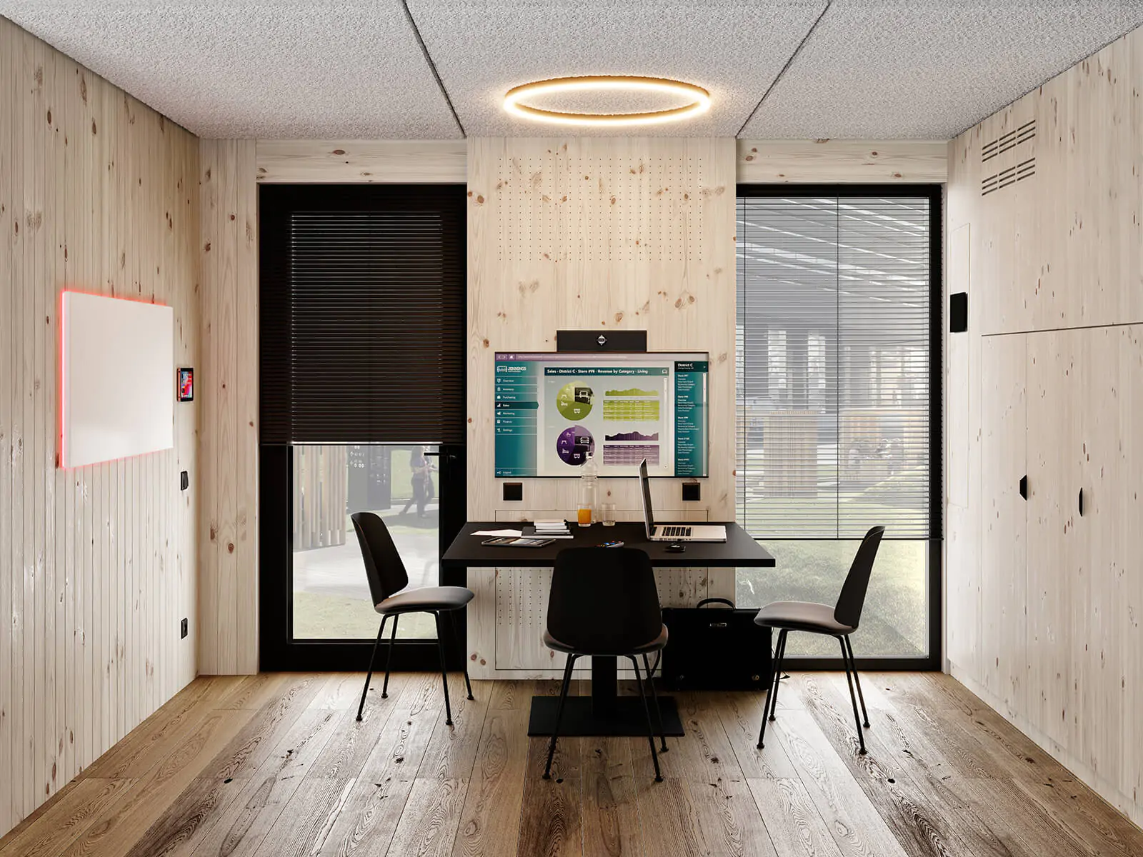 Per ogni dettaglio sono state scelte le migliori tecnologie: pareti di legno massiccio che non richiedono l’utilizzo di colle, infissi con triplo vetro isolante, pannello a infrarossi, sistemi smart per il controllo degli accessi, schermi e soundbar per la gestione di videoconferenze.